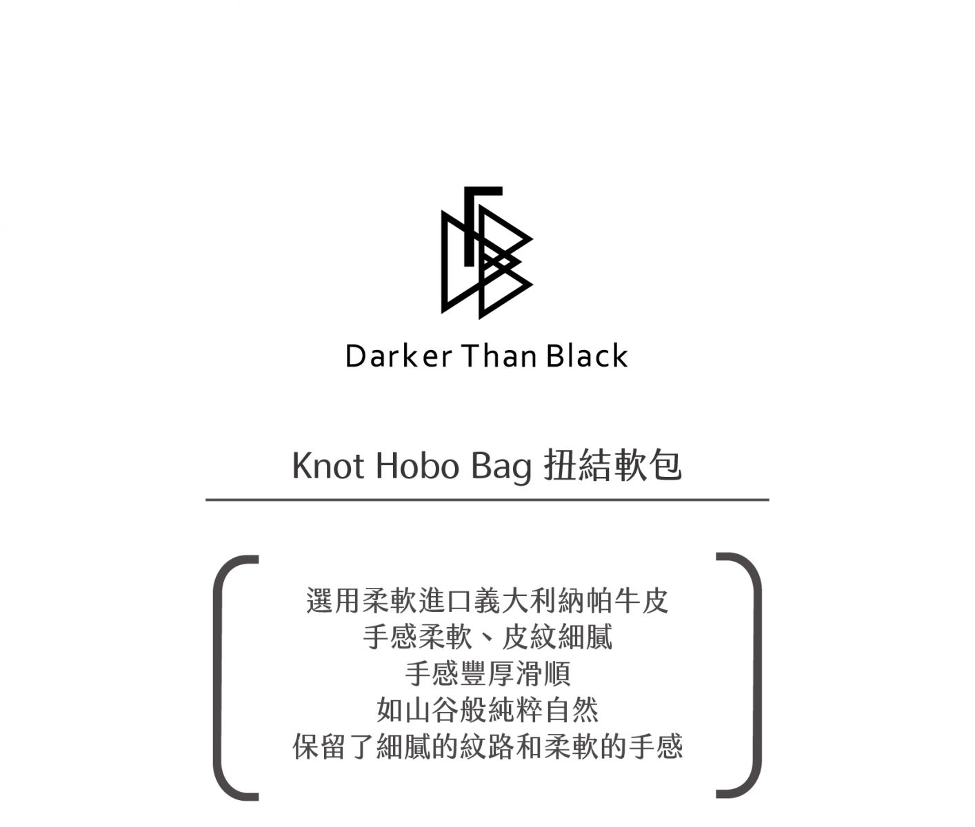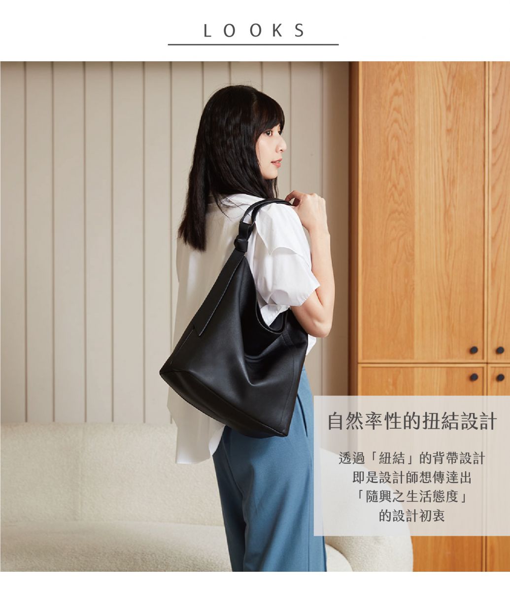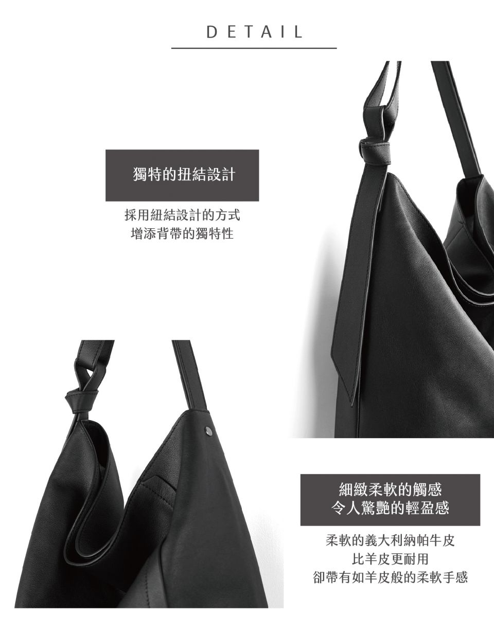 選用柔軟進口義大利納帕牛皮 手感柔軟、皮紋細膩 手感豐厚滑順 如山谷般純粹自然 保留了細膩的紋路和柔軟的手感 -特色扭結背帶設計 -軟包硬底設計 -隱形磁釦設計 -拉鍊內袋