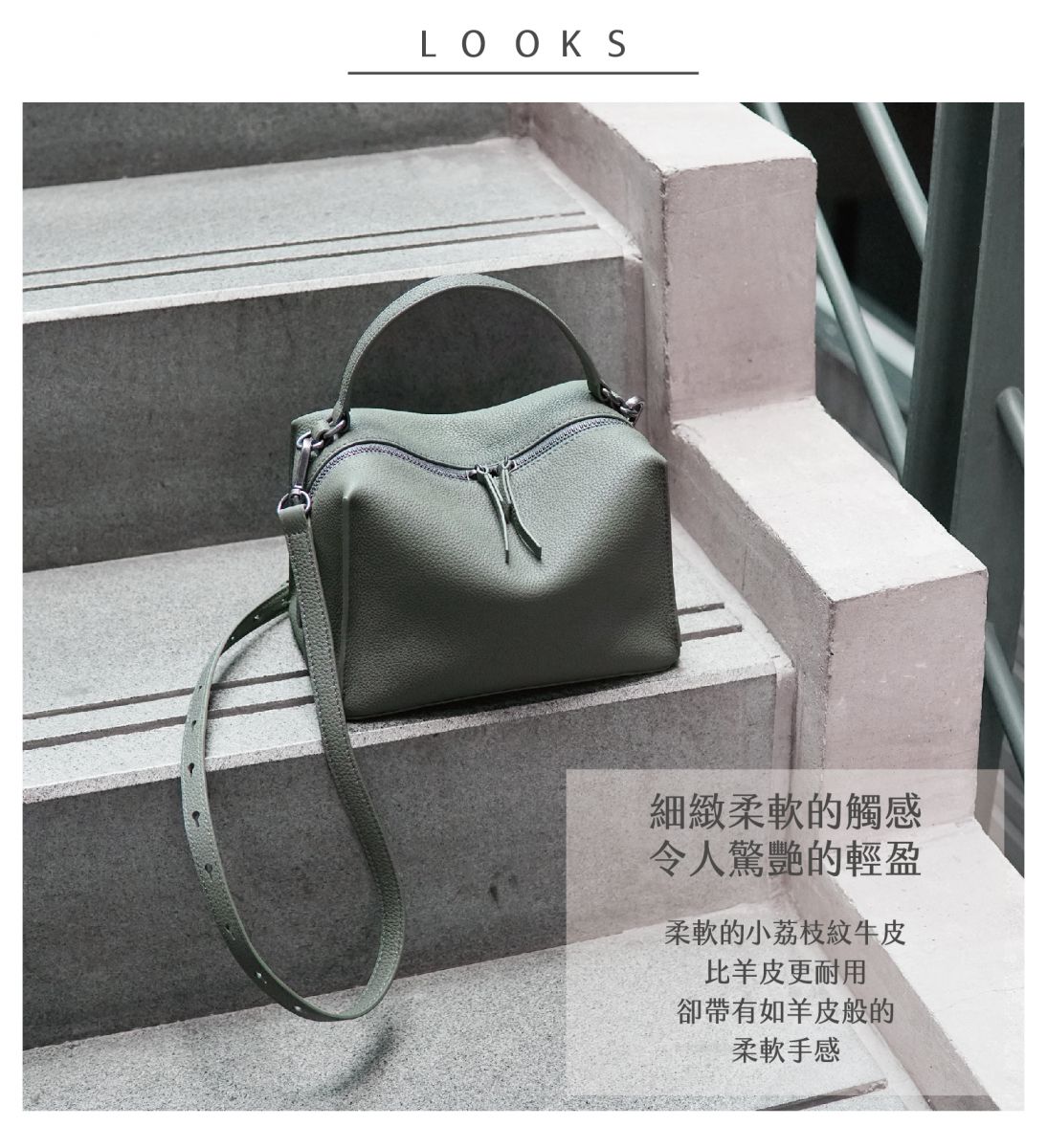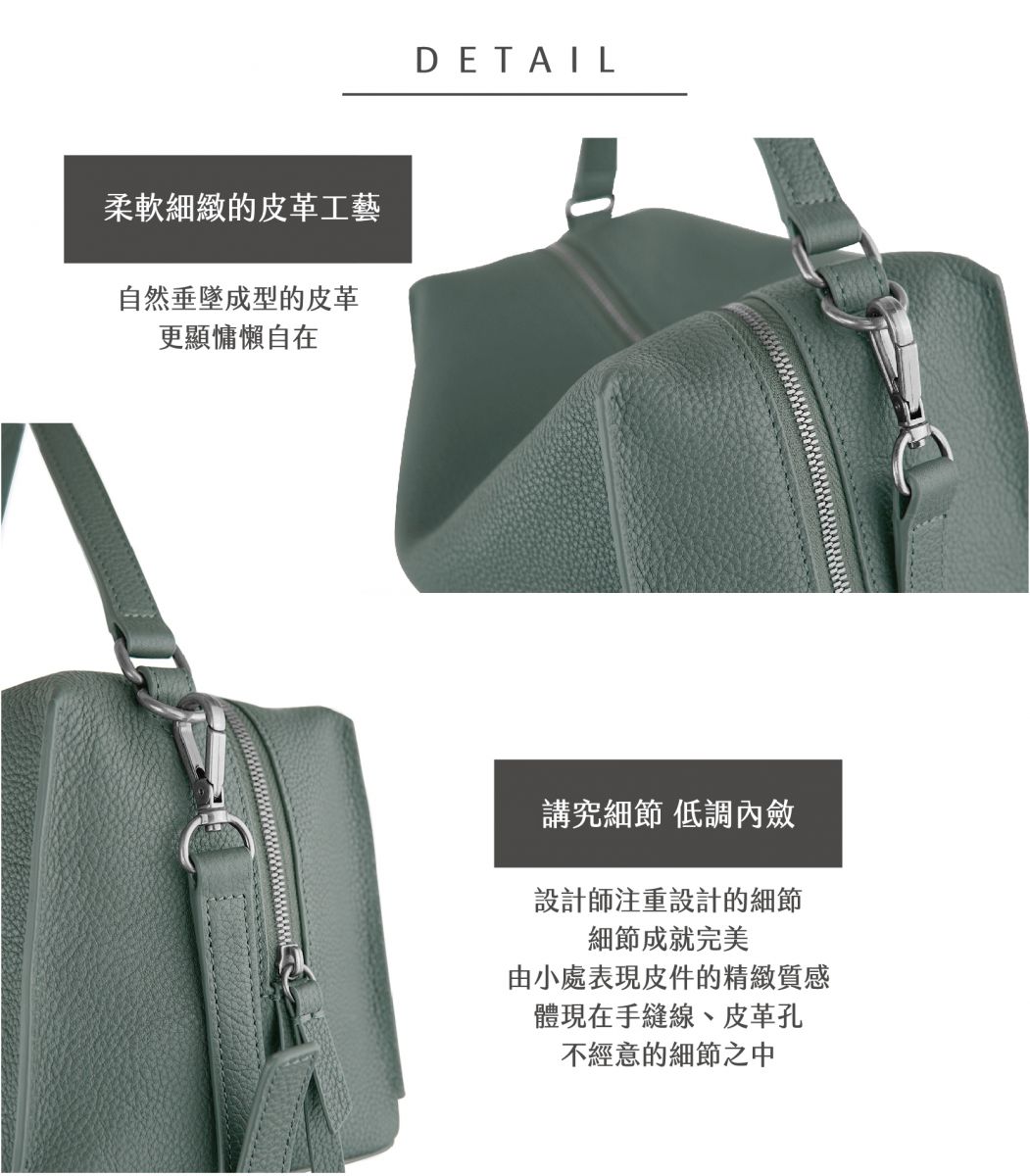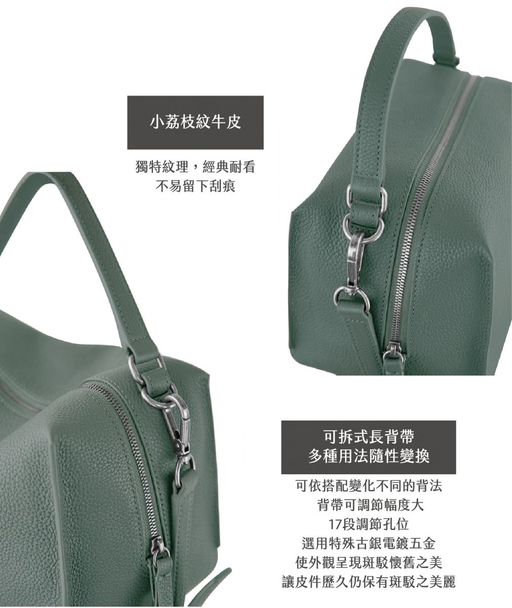 選用柔軟小荔枝紋牛皮 手感柔軟、皮紋細膩 手感豐厚滑順 皮革不易起皺,容易收藏與保存 -手提/側背/斜背多用途 -外袋雙拉頭拉鍊 -可拆/可調節背帶 -拉鍊內袋 -軟包硬底設計 -適合上班/旅行時使用 -可放長夾